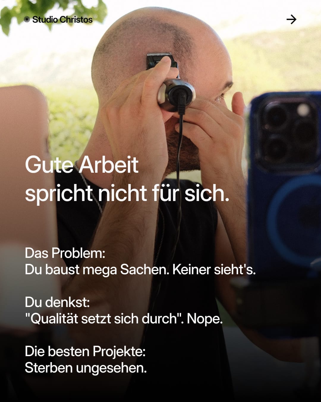 Das ist die Lüge, die wir uns als "bescheidene" Profis erzählen. "Ich lass lieber meine Arbeit sprechen." Klingt edel. Ist aber Schwachsinn.