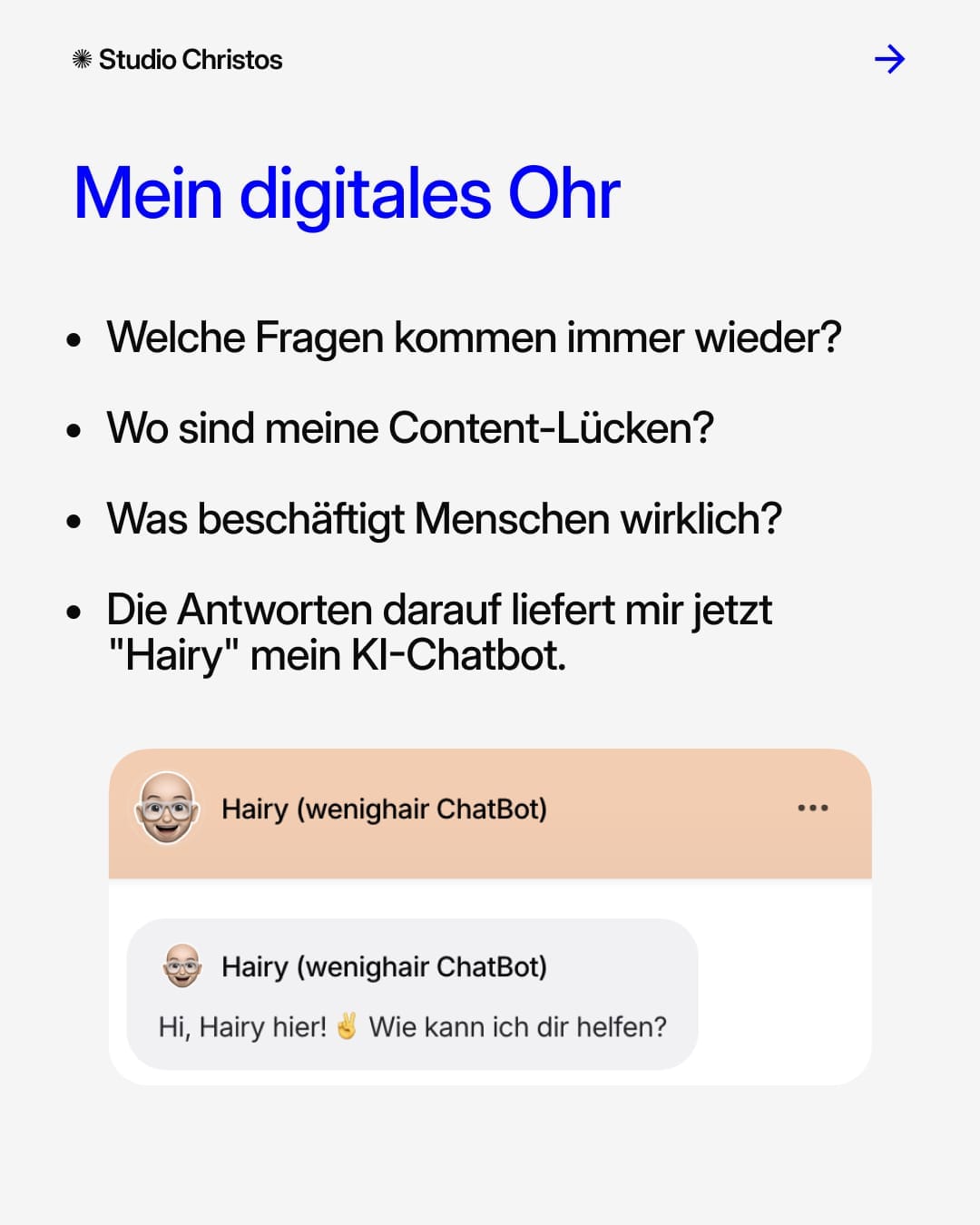 Wie erreichst du Menschen bei einem sensiblen Thema wie Haarausfall? Die meisten machen es falsch: FAQ-Seite mit zwanzig vorhersehbaren Fragen, generische Antworten, die niemandem helfen. "Kontaktiere uns für mehr Informationen." Als ob jemand bei etwas so Persönlichem wie Haarausfall einfach eine E-Mail schreibt.