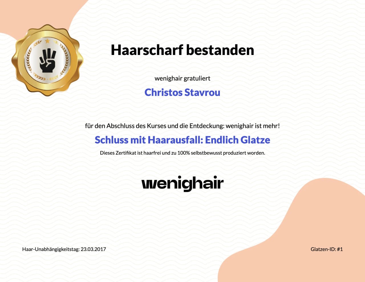 Beschreibung: Ja, ich habe mir selbst ein Zertifikat ausgestellt. Dieses „Zertifikat" steht für den Startschuss meines Bootstrap-Startups wenighair mit 500+ YouTube-Videos, jährlich 145.000 Besuchern und der größten Glatzen-Community im DACH-Raum, komplett ohne Paid Ads organisch gewachsen (im Gegensatz zu meinen Haaren).