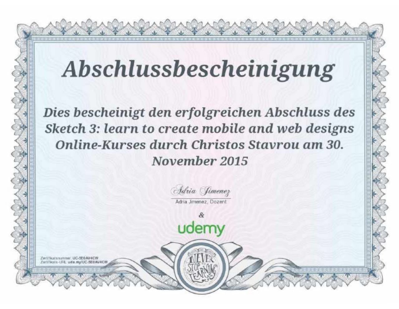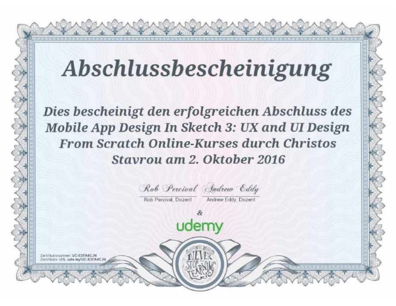 Zertifikat: Mobile App Design in Sketch 3: UX and UI Design From Scratch
